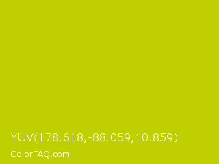 YUV 178.618,-88.059,10.859 Color is a normal yellow color and the nearest color is Rio Grande #bbd009. Hex code #bfcf00 and RGB value is rgb(191,207,-0). In RGB color space, this color is composed of 75% red, 81% green, 0% blue, In CMYK color space, this color is composed of 8% cyan, 0% magenta, 100% yellow , 19% black , In HSL color space, this color has a hue angle of 65° , 100% saturation and 41% lightness.