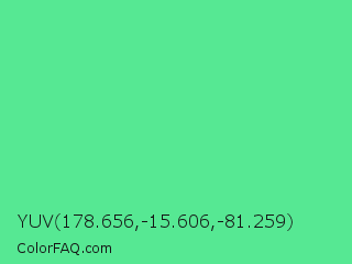 YUV 178.656,-15.606,-81.259 Color is a light green color and the nearest color is Very Light Malachite Green #64e986. Hex code #56e893 and RGB value is rgb(86,232,147). In RGB color space, this color is composed of 34% red, 91% green, 58% blue, In CMYK color space, this color is composed of 63% cyan, 0% magenta, 37% yellow , 9% black , In HSL color space, this color has a hue angle of 145° , 76% saturation and 62% lightness.