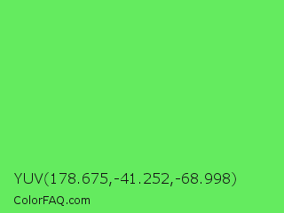 YUV 178.675,-41.252,-68.998 Color is a light green color and the nearest color is Screamin Green #66ff66. Hex code #64eb5f and RGB value is rgb(100,235,95). In RGB color space, this color is composed of 39% red, 92% green, 37% blue, In CMYK color space, this color is composed of 57% cyan, 0% magenta, 60% yellow , 8% black , In HSL color space, this color has a hue angle of 118° , 78% saturation and 65% lightness.