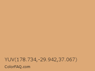 YUV 178.734,-29.942,37.067 Color is a light orange color and the nearest color is Fawn #e5aa70. Hex code #dda976 and RGB value is rgb(221,169,118). In RGB color space, this color is composed of 87% red, 66% green, 46% blue, In CMYK color space, this color is composed of 0% cyan, 24% magenta, 47% yellow , 13% black , In HSL color space, this color has a hue angle of 30° , 60% saturation and 66% lightness.