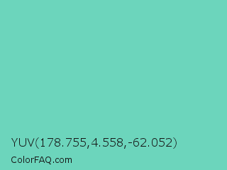 YUV 178.755,4.558,-62.052 Color is a light cyan color and the nearest color is Downy #6fd0c5. Hex code #6cd5bc and RGB value is rgb(108,213,188). In RGB color space, this color is composed of 42% red, 84% green, 74% blue, In CMYK color space, this color is composed of 49% cyan, 0% magenta, 12% yellow , 16% black , In HSL color space, this color has a hue angle of 166° , 56% saturation and 63% lightness.