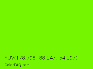 YUV 178.798,-88.147,-54.197 Color is a normal green color and the nearest color is Lawn Green #7cfc00. Hex code #75f500 and RGB value is rgb(117,245,-0). In RGB color space, this color is composed of 46% red, 96% green, 0% blue, In CMYK color space, this color is composed of 52% cyan, 0% magenta, 100% yellow , 4% black , In HSL color space, this color has a hue angle of 91° , 100% saturation and 48% lightness.