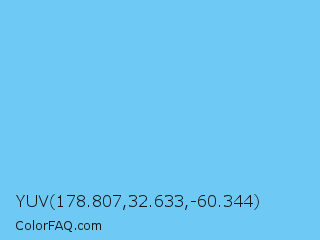 YUV 178.807,32.633,-60.344 Color is a light blue color and the nearest color is Maya Blue #73c2fb. Hex code #6ec9f5 and RGB value is rgb(110,201,245). In RGB color space, this color is composed of 43% red, 79% green, 96% blue, In CMYK color space, this color is composed of 55% cyan, 18% magenta, 0% yellow , 4% black , In HSL color space, this color has a hue angle of 200° , 87% saturation and 70% lightness.