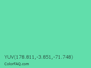 YUV 178.811,-3.851,-71.748 Color is a light green color and the nearest color is Medium Aquamarine #66ddaa. Hex code #61deab and RGB value is rgb(97,222,171). In RGB color space, this color is composed of 38% red, 87% green, 67% blue, In CMYK color space, this color is composed of 56% cyan, 0% magenta, 23% yellow , 13% black , In HSL color space, this color has a hue angle of 156° , 65% saturation and 63% lightness.
