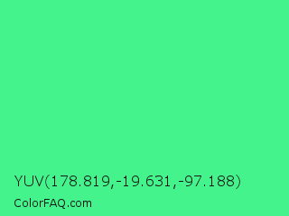 YUV 178.819,-19.631,-97.188 Color is a light green color and the nearest color is Very Light Malachite Green #64e986. Hex code #44f38b and RGB value is rgb(68,243,139). In RGB color space, this color is composed of 27% red, 95% green, 55% blue, In CMYK color space, this color is composed of 72% cyan, 0% magenta, 43% yellow , 5% black , In HSL color space, this color has a hue angle of 144° , 88% saturation and 61% lightness.