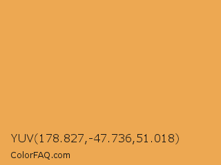 YUV 178.827,-47.736,51.018 Color is a light orange color and the nearest color is Indian Yellow #e3a857. Hex code #eda852 and RGB value is rgb(237,168,82). In RGB color space, this color is composed of 93% red, 66% green, 32% blue, In CMYK color space, this color is composed of 0% cyan, 29% magenta, 65% yellow , 7% black , In HSL color space, this color has a hue angle of 33° , 81% saturation and 63% lightness.