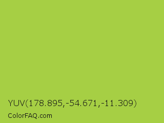 YUV 178.895,-54.671,-11.309 Color is a normal lime color and the nearest color is Android Green #a4c639. Hex code #a6cf44 and RGB value is rgb(166,207,68). In RGB color space, this color is composed of 65% red, 81% green, 27% blue, In CMYK color space, this color is composed of 20% cyan, 0% magenta, 67% yellow , 19% black , In HSL color space, this color has a hue angle of 78° , 59% saturation and 54% lightness.