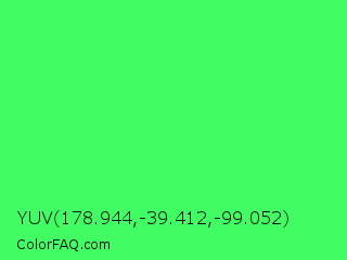 YUV 178.944,-39.412,-99.052 Color is a light green color and the nearest color is Screamin Green #66ff66. Hex code #42fc63 and RGB value is rgb(66,252,99). In RGB color space, this color is composed of 26% red, 99% green, 39% blue, In CMYK color space, this color is composed of 74% cyan, 0% magenta, 61% yellow , 1% black , In HSL color space, this color has a hue angle of 131° , 97% saturation and 62% lightness.
