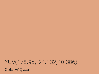 YUV 178.95,-24.132,40.386 Color is a light orange color and the nearest color is Tumbleweed #dea681. Hex code #e1a582 and RGB value is rgb(225,165,130). In RGB color space, this color is composed of 88% red, 65% green, 51% blue, In CMYK color space, this color is composed of 0% cyan, 27% magenta, 42% yellow , 12% black , In HSL color space, this color has a hue angle of 22° , 61% saturation and 70% lightness.