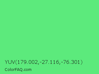 YUV 179.002,-27.116,-76.301 Color is a light green color and the nearest color is Very Light Malachite Green #64e986. Hex code #5cea7c and RGB value is rgb(92,234,124). In RGB color space, this color is composed of 36% red, 92% green, 49% blue, In CMYK color space, this color is composed of 61% cyan, 0% magenta, 47% yellow , 8% black , In HSL color space, this color has a hue angle of 134° , 77% saturation and 64% lightness.