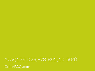 YUV 179.023,-78.891,10.504 Color is a normal yellow color and the nearest color is Rio Grande #bbd009. Hex code #bfcc13 and RGB value is rgb(191,204,19). In RGB color space, this color is composed of 75% red, 80% green, 7% blue, In CMYK color space, this color is composed of 6% cyan, 0% magenta, 91% yellow , 20% black , In HSL color space, this color has a hue angle of 64° , 83% saturation and 44% lightness.