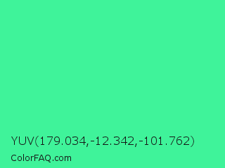YUV 179.034,-12.342,-101.762 Color is a normal green color and the nearest color is Eucalyptus #44d7a8. Hex code #3ff39a and RGB value is rgb(63,243,154). In RGB color space, this color is composed of 25% red, 95% green, 60% blue, In CMYK color space, this color is composed of 74% cyan, 0% magenta, 37% yellow , 5% black , In HSL color space, this color has a hue angle of 150° , 88% saturation and 60% lightness.
