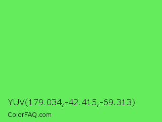 YUV 179.034,-42.415,-69.313 Color is a light green color and the nearest color is Screamin Green #66ff66. Hex code #64ec5d and RGB value is rgb(100,236,93). In RGB color space, this color is composed of 39% red, 93% green, 36% blue, In CMYK color space, this color is composed of 58% cyan, 0% magenta, 61% yellow , 7% black , In HSL color space, this color has a hue angle of 117° , 79% saturation and 65% lightness.
