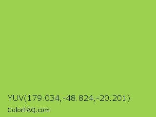 YUV 179.034,-48.824,-20.201 Color is a normal green color and the nearest color is Conifer #acdd4d. Hex code #9cd250 and RGB value is rgb(156,210,80). In RGB color space, this color is composed of 61% red, 82% green, 31% blue, In CMYK color space, this color is composed of 26% cyan, 0% magenta, 62% yellow , 18% black , In HSL color space, this color has a hue angle of 85° , 59% saturation and 57% lightness.