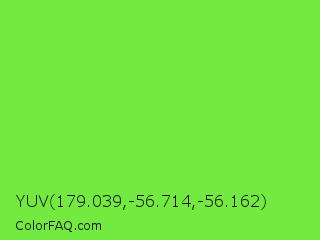 YUV 179.039,-56.714,-56.162 Color is a normal green color and the nearest color is Kiwi #8ee53f. Hex code #73ea40 and RGB value is rgb(115,234,64). In RGB color space, this color is composed of 45% red, 92% green, 25% blue, In CMYK color space, this color is composed of 51% cyan, 0% magenta, 73% yellow , 8% black , In HSL color space, this color has a hue angle of 102° , 80% saturation and 58% lightness.