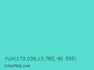 YUV 179.039,13.785,-81.595 Color is a normal cyan color and the nearest color is Medium Turquoise #48d1cc. Hex code #56ddcf and RGB value is rgb(86,221,207). In RGB color space, this color is composed of 34% red, 87% green, 81% blue, In CMYK color space, this color is composed of 61% cyan, 0% magenta, 6% yellow , 13% black , In HSL color space, this color has a hue angle of 174° , 67% saturation and 60% lightness.