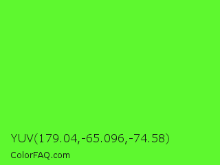 YUV 179.04,-65.096,-74.58 Color is a normal green color and the nearest color is Spring Frost #87ff2a. Hex code #5ef82f and RGB value is rgb(94,248,47). In RGB color space, this color is composed of 37% red, 97% green, 18% blue, In CMYK color space, this color is composed of 62% cyan, 0% magenta, 81% yellow , 3% black , In HSL color space, this color has a hue angle of 106° , 93% saturation and 58% lightness.