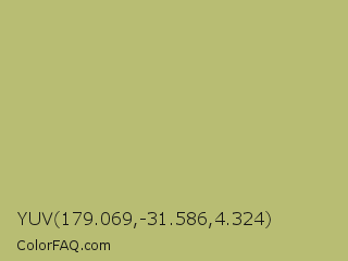 YUV 179.069,-31.586,4.324 Color is a normal yellow color and the nearest color is Misty Moss #bbb477. Hex code #b8bd73 and RGB value is rgb(184,189,115). In RGB color space, this color is composed of 72% red, 74% green, 45% blue, In CMYK color space, this color is composed of 3% cyan, 0% magenta, 39% yellow , 26% black , In HSL color space, this color has a hue angle of 64° , 36% saturation and 60% lightness.