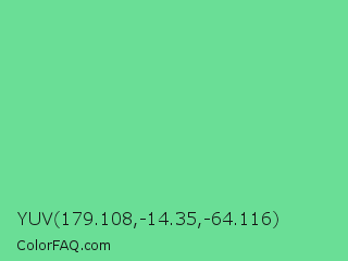 YUV 179.108,-14.35,-64.116 Color is a light green color and the nearest color is Very Light Malachite Green #64e986. Hex code #6ade96 and RGB value is rgb(106,222,150). In RGB color space, this color is composed of 42% red, 87% green, 59% blue, In CMYK color space, this color is composed of 52% cyan, 0% magenta, 32% yellow , 13% black , In HSL color space, this color has a hue angle of 143° , 64% saturation and 64% lightness.