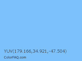 YUV 179.166,34.921,-47.504 Color is a light blue color and the nearest color is Malibu #7dc8f7. Hex code #7dc1fa and RGB value is rgb(125,193,250). In RGB color space, this color is composed of 49% red, 76% green, 98% blue, In CMYK color space, this color is composed of 50% cyan, 23% magenta, 0% yellow , 2% black , In HSL color space, this color has a hue angle of 207° , 93% saturation and 74% lightness.