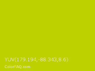 YUV 179.194,-88.343,8.6 Color is a normal yellow color and the nearest color is Rio Grande #bbd009. Hex code #bdd100 and RGB value is rgb(189,209,-0). In RGB color space, this color is composed of 74% red, 82% green, 0% blue, In CMYK color space, this color is composed of 10% cyan, 0% magenta, 100% yellow , 18% black , In HSL color space, this color has a hue angle of 66° , 100% saturation and 41% lightness.