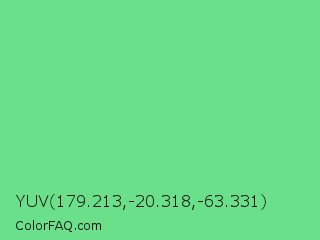 YUV 179.213,-20.318,-63.331 Color is a light green color and the nearest color is Very Light Malachite Green #64e986. Hex code #6be08a and RGB value is rgb(107,224,138). In RGB color space, this color is composed of 42% red, 88% green, 54% blue, In CMYK color space, this color is composed of 52% cyan, 0% magenta, 38% yellow , 12% black , In HSL color space, this color has a hue angle of 136° , 65% saturation and 65% lightness.