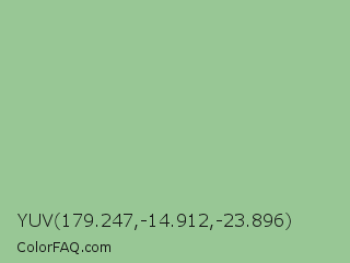 YUV 179.247,-14.912,-23.896 Color is a light green color and the nearest color is Eton Blue #96c8a2. Hex code #98c795 and RGB value is rgb(152,199,149). In RGB color space, this color is composed of 60% red, 78% green, 58% blue, In CMYK color space, this color is composed of 24% cyan, 0% magenta, 25% yellow , 22% black , In HSL color space, this color has a hue angle of 116° , 31% saturation and 68% lightness.