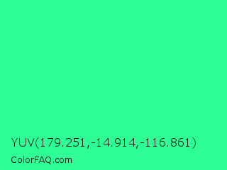 YUV 179.251,-14.914,-116.861 Color is a normal green color and the nearest color is Medium Spring Green #00fa9a. Hex code #2efd95 and RGB value is rgb(46,253,149). In RGB color space, this color is composed of 18% red, 99% green, 58% blue, In CMYK color space, this color is composed of 82% cyan, 0% magenta, 41% yellow , 1% black , In HSL color space, this color has a hue angle of 150° , 98% saturation and 59% lightness.