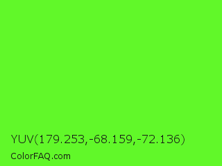 YUV 179.253,-68.159,-72.136 Color is a normal green color and the nearest color is Spring Frost #87ff2a. Hex code #61f829 and RGB value is rgb(97,248,41). In RGB color space, this color is composed of 38% red, 97% green, 16% blue, In CMYK color space, this color is composed of 61% cyan, 0% magenta, 83% yellow , 3% black , In HSL color space, this color has a hue angle of 104° , 94% saturation and 57% lightness.