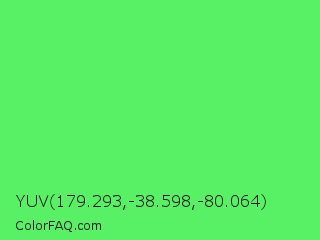 YUV 179.293,-38.598,-80.064 Color is a light green color and the nearest color is Screamin Green #66ff66. Hex code #58f165 and RGB value is rgb(88,241,101). In RGB color space, this color is composed of 35% red, 95% green, 40% blue, In CMYK color space, this color is composed of 63% cyan, 0% magenta, 58% yellow , 5% black , In HSL color space, this color has a hue angle of 125° , 85% saturation and 65% lightness.
