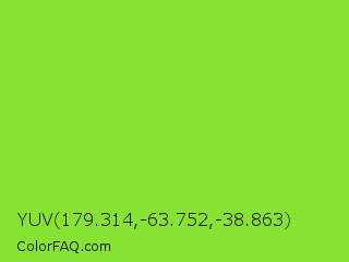YUV 179.314,-63.752,-38.863 Color is a normal green color and the nearest color is Kiwi #8ee53f. Hex code #87e332 and RGB value is rgb(135,227,50). In RGB color space, this color is composed of 53% red, 89% green, 20% blue, In CMYK color space, this color is composed of 41% cyan, 0% magenta, 78% yellow , 11% black , In HSL color space, this color has a hue angle of 91° , 76% saturation and 54% lightness.