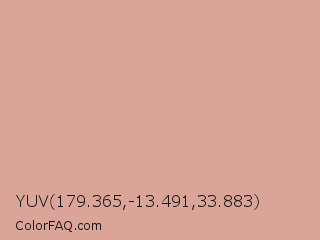 YUV 179.365,-13.491,33.883 Color is a light red color and the nearest color is Eunry #cfa39d. Hex code #daa598 and RGB value is rgb(218,165,152). In RGB color space, this color is composed of 85% red, 65% green, 60% blue, In CMYK color space, this color is composed of 0% cyan, 24% magenta, 30% yellow , 15% black , In HSL color space, this color has a hue angle of 12° , 47% saturation and 73% lightness.