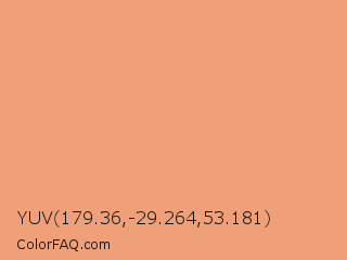 YUV 179.36,-29.264,53.181 Color is a light orange color and the nearest color is Dark Salmon #e9967a. Hex code #f0a078 and RGB value is rgb(240,160,120). In RGB color space, this color is composed of 94% red, 63% green, 47% blue, In CMYK color space, this color is composed of 0% cyan, 33% magenta, 50% yellow , 6% black , In HSL color space, this color has a hue angle of 20° , 80% saturation and 71% lightness.