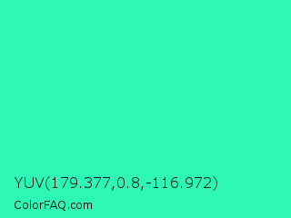 YUV 179.377,0.8,-116.972 Color is a normal green color and the nearest color is Turquoise PWG #30d5c8. Hex code #2ef7b5 and RGB value is rgb(46,247,181). In RGB color space, this color is composed of 18% red, 97% green, 71% blue, In CMYK color space, this color is composed of 81% cyan, 0% magenta, 27% yellow , 3% black , In HSL color space, this color has a hue angle of 160° , 93% saturation and 57% lightness.