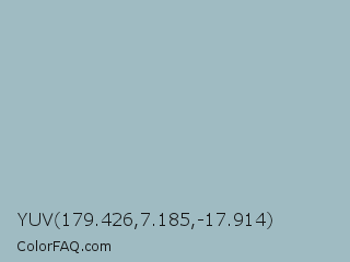 YUV 179.426,7.185,-17.914 Color is a light cyan color and the nearest color is Tower Gray #a9bdbf. Hex code #9fbbc2 and RGB value is rgb(159,187,194). In RGB color space, this color is composed of 62% red, 73% green, 76% blue, In CMYK color space, this color is composed of 18% cyan, 4% magenta, 0% yellow , 24% black , In HSL color space, this color has a hue angle of 192° , 22% saturation and 69% lightness.