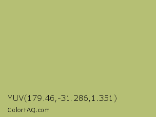 YUV 179.46,-31.286,1.351 Color is a normal yellow color and the nearest color is Wild Willow #b9c46a. Hex code #b5bf74 and RGB value is rgb(181,191,116). In RGB color space, this color is composed of 71% red, 75% green, 45% blue, In CMYK color space, this color is composed of 5% cyan, 0% magenta, 39% yellow , 25% black , In HSL color space, this color has a hue angle of 68° , 37% saturation and 60% lightness.