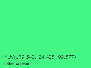 YUV 179.543,-24.425,-99.577 Color is a light green color and the nearest color is Very Light Malachite Green #64e986. Hex code #42f782 and RGB value is rgb(66,247,130). In RGB color space, this color is composed of 26% red, 97% green, 51% blue, In CMYK color space, this color is composed of 73% cyan, 0% magenta, 47% yellow , 3% black , In HSL color space, this color has a hue angle of 141° , 92% saturation and 61% lightness.