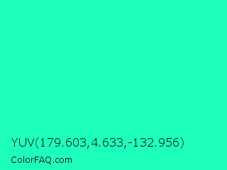 YUV 179.603,4.633,-132.956 Color is a normal green color and the nearest color is Bright Turquoise #08e8de. Hex code #1cffbd and RGB value is rgb(28,255,189). In RGB color space, this color is composed of 11% red, 100% green, 74% blue, In CMYK color space, this color is composed of 89% cyan, 0% magenta, 26% yellow , 0% black , In HSL color space, this color has a hue angle of 163° , 100% saturation and 55% lightness.