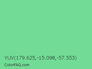 YUV 179.625,-15.098,-57.553 Color is a light green color and the nearest color is Medium Aquamarine #66ddaa. Hex code #72db95 and RGB value is rgb(114,219,149). In RGB color space, this color is composed of 45% red, 86% green, 58% blue, In CMYK color space, this color is composed of 48% cyan, 0% magenta, 32% yellow , 14% black , In HSL color space, this color has a hue angle of 140° , 59% saturation and 65% lightness.