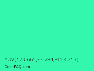 YUV 179.661,-3.284,-113.713 Color is a normal green color and the nearest color is Eucalyptus #44d7a8. Hex code #32f7ad and RGB value is rgb(50,247,173). In RGB color space, this color is composed of 20% red, 97% green, 68% blue, In CMYK color space, this color is composed of 80% cyan, 0% magenta, 30% yellow , 3% black , In HSL color space, this color has a hue angle of 157° , 92% saturation and 58% lightness.