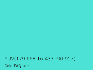YUV 179.668,16.433,-90.917 Color is a normal cyan color and the nearest color is Turquoise #40e0d0. Hex code #4ce2d5 and RGB value is rgb(76,226,213). In RGB color space, this color is composed of 30% red, 89% green, 84% blue, In CMYK color space, this color is composed of 66% cyan, 0% magenta, 6% yellow , 11% black , In HSL color space, this color has a hue angle of 175° , 72% saturation and 59% lightness.