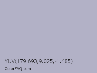 YUV 179.693,9.025,-1.485 Color is a light indigo color and the nearest color is Cadet Blue #a9b2c3. Hex code #b2b1c6 and RGB value is rgb(178,177,198). In RGB color space, this color is composed of 70% red, 69% green, 78% blue, In CMYK color space, this color is composed of 10% cyan, 11% magenta, 0% yellow , 22% black , In HSL color space, this color has a hue angle of 243° , 16% saturation and 74% lightness.