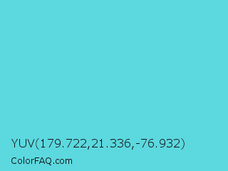 YUV 179.722,21.336,-76.932 Color is a light cyan color and the nearest color is Viking #64ccdb. Hex code #5cd8df and RGB value is rgb(92,216,223). In RGB color space, this color is composed of 36% red, 85% green, 87% blue, In CMYK color space, this color is composed of 59% cyan, 3% magenta, 0% yellow , 13% black , In HSL color space, this color has a hue angle of 183° , 67% saturation and 62% lightness.