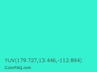 YUV 179.727,13.446,-112.894 Color is a normal cyan color and the nearest color is Turquoise #40e0d0. Hex code #33f0cf and RGB value is rgb(51,240,207). In RGB color space, this color is composed of 20% red, 94% green, 81% blue, In CMYK color space, this color is composed of 79% cyan, 0% magenta, 14% yellow , 6% black , In HSL color space, this color has a hue angle of 170° , 86% saturation and 57% lightness.