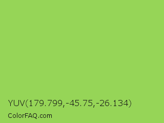 YUV 179.799,-45.75,-26.134 Color is a normal green color and the nearest color is Conifer #acdd4d. Hex code #96d557 and RGB value is rgb(150,213,87). In RGB color space, this color is composed of 59% red, 84% green, 34% blue, In CMYK color space, this color is composed of 30% cyan, 0% magenta, 59% yellow , 16% black , In HSL color space, this color has a hue angle of 90° , 60% saturation and 59% lightness.
