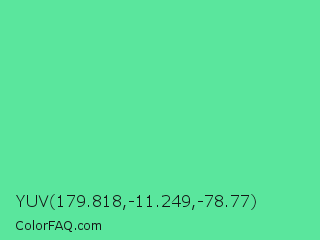 YUV 179.818,-11.249,-78.77 Color is a light green color and the nearest color is Medium Aquamarine #66ddaa. Hex code #5ae69d and RGB value is rgb(90,230,157). In RGB color space, this color is composed of 35% red, 90% green, 62% blue, In CMYK color space, this color is composed of 61% cyan, 0% magenta, 32% yellow , 10% black , In HSL color space, this color has a hue angle of 149° , 74% saturation and 63% lightness.