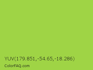 YUV 179.851,-54.65,-18.286 Color is a normal green color and the nearest color is Conifer #acdd4d. Hex code #9fd445 and RGB value is rgb(159,212,69). In RGB color space, this color is composed of 62% red, 83% green, 27% blue, In CMYK color space, this color is composed of 25% cyan, 0% magenta, 67% yellow , 17% black , In HSL color space, this color has a hue angle of 82° , 62% saturation and 55% lightness.