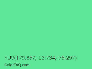 YUV 179.857,-13.734,-75.297 Color is a light green color and the nearest color is Very Light Malachite Green #64e986. Hex code #5ee598 and RGB value is rgb(94,229,152). In RGB color space, this color is composed of 37% red, 90% green, 60% blue, In CMYK color space, this color is composed of 59% cyan, 0% magenta, 34% yellow , 10% black , In HSL color space, this color has a hue angle of 146° , 72% saturation and 63% lightness.