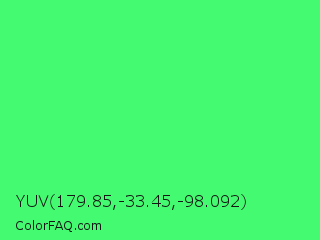YUV 179.85,-33.45,-98.092 Color is a light green color and the nearest color is Screamin Green #66ff66. Hex code #44fa70 and RGB value is rgb(68,250,112). In RGB color space, this color is composed of 27% red, 98% green, 44% blue, In CMYK color space, this color is composed of 73% cyan, 0% magenta, 55% yellow , 2% black , In HSL color space, this color has a hue angle of 135° , 95% saturation and 62% lightness.