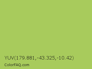 YUV 179.881,-43.325,-10.42 Color is a normal lime color and the nearest color is Middle Green Yellow #acbf60. Hex code #a8cb5c and RGB value is rgb(168,203,92). In RGB color space, this color is composed of 66% red, 80% green, 36% blue, In CMYK color space, this color is composed of 17% cyan, 0% magenta, 55% yellow , 20% black , In HSL color space, this color has a hue angle of 79° , 52% saturation and 58% lightness.